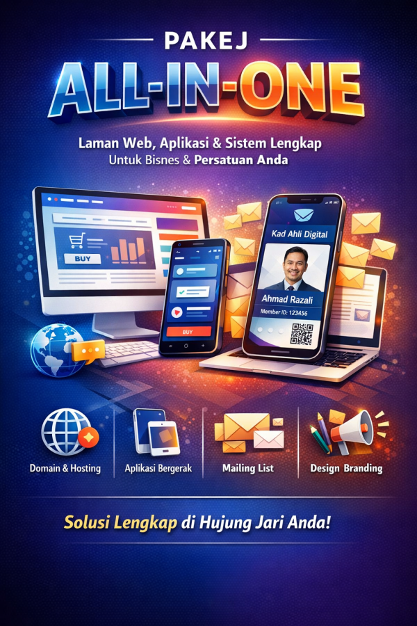 “Pakej All-in-One termasuk laman web, aplikasi bergerak, mailing list, kad digital, hosting & domain, serta sokongan teknikal lengkap – sesuai untuk bisnes atau persatuan anda.” ✅